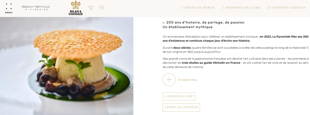 Impossible de parler cuisine française sans évoquer ce lieu. Le restaurant possède une histoire forte. La maison a longtemps porté l’empreinte de Fernand Point, figure majeure de la cuisine française. Aujourd’hui encore, l’établissement conserve cette réputation.